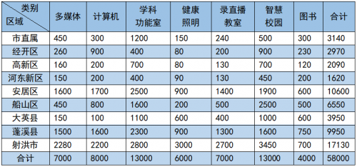 根据《四川省中小学教育技术装备标准》《四川省义务教育优质均衡发展主要指标评估细则》《智慧校园建设标准》《遂宁市“十四五”教育事业发展规划》,遂宁市未来5年教育装备预计投入5.8亿元,其中多媒体一体机(含智慧黑板等)7千万元、计算机8千万元、功能室(含理化生学科教室器材设施、音体美设备、创客空间、课桌椅等)1.3亿元、健康照明6千万元、录直播设备7千万元、智慧校园1.3亿元、图书4千万元。
